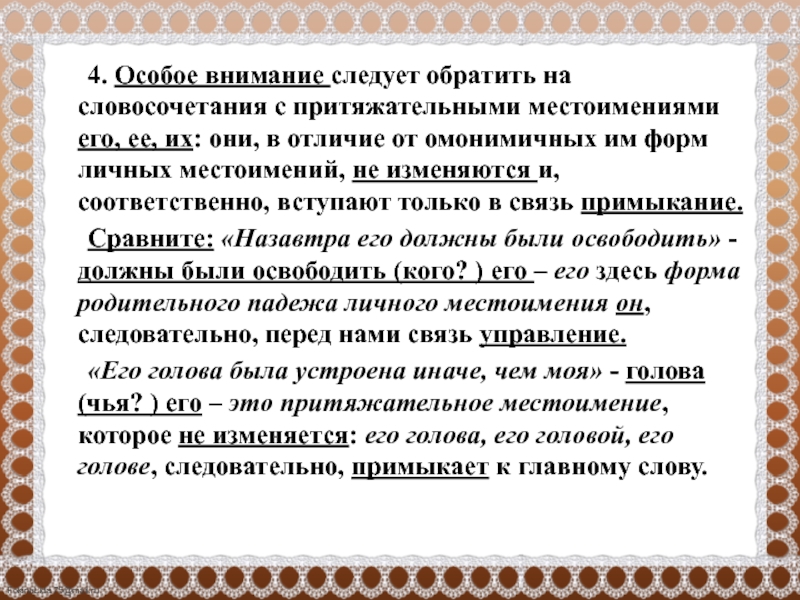 Слайд 13 4. Особое внимание следует обратить на словосочетания с притяжательными местоимениями его,