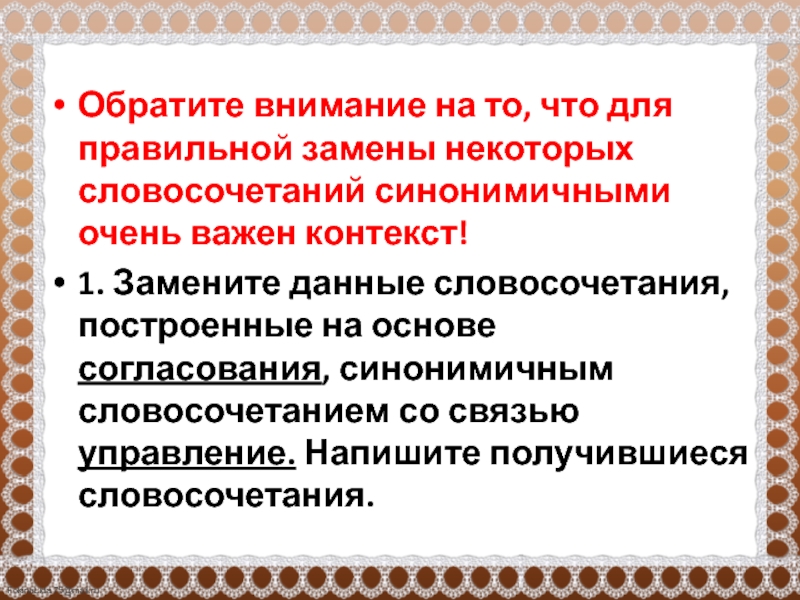 Слайд 25Обратите внимание на то, что для правильной замены некоторых словосочетаний синонимичными
