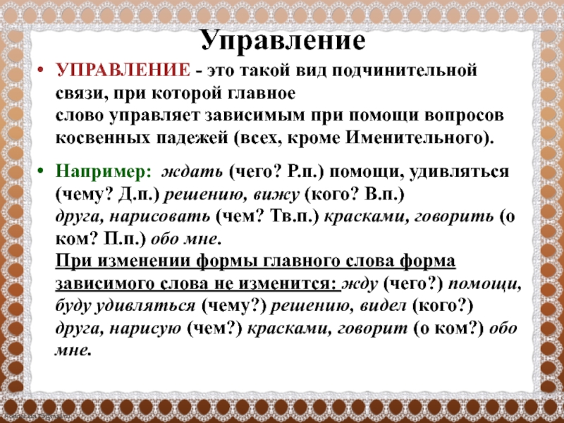 УПРАВЛЕНИЕ - это такой вид подчинительной связи, при которой главное слово управляет зависимым при