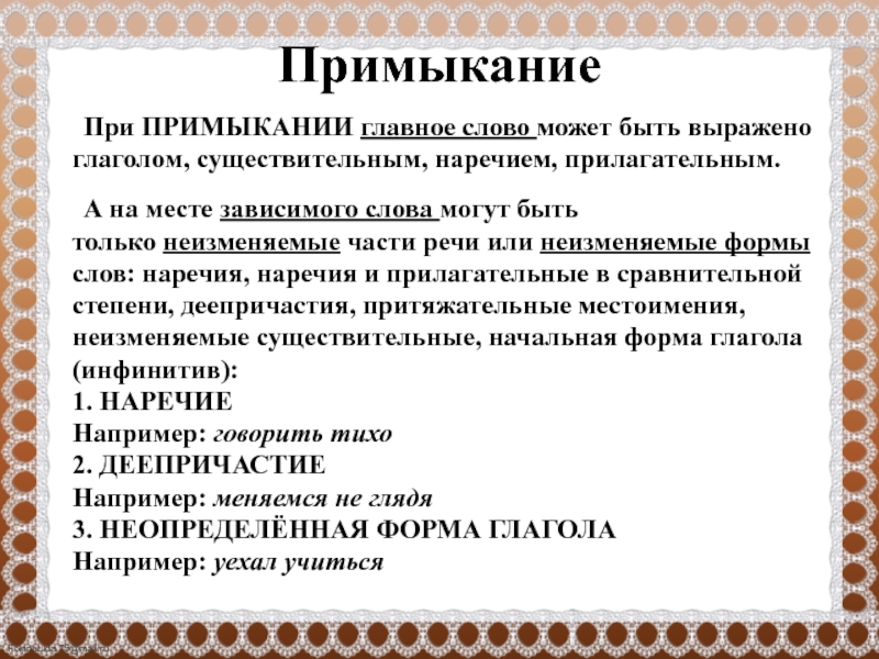 При ПРИМЫКАНИИ главное слово может быть выражено глаголом, существительным, наречием, прилагательным.