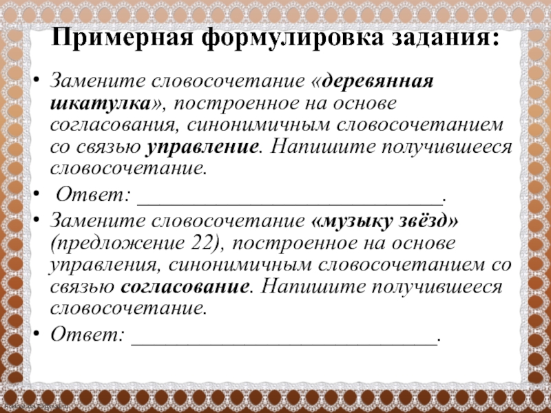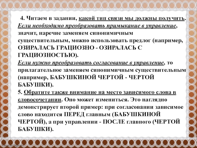 Слайд 24Задание 4. ЗАМЕНИТЬ ДАННЫЕ СЛОВОСОЧЕТАНИЯ СО СПОСОБОМ СВЯЗИ УПРАВЛЕНИЕ СИНОНИМИЧНЫМИ СО