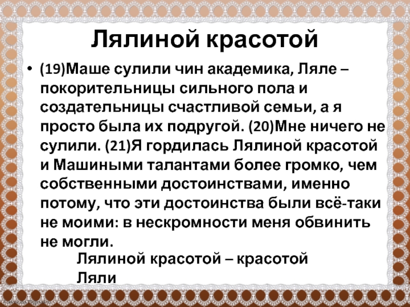 создательницы счастливой семьи, а я просто была их подругой. (20)Мне ничего не сулили. (21)Я гордилась Лялиной красотой и Машиными талантами более громко, чем собственными достоинствами, именно потому, что эти достоинства были всё-таки не моими: в нескромности меня обвинить не могли.