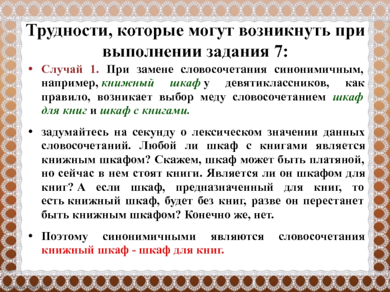 словосочетания синонимичным, например, книжный шкаф у девятиклассников, как правило, возникает выбор меду словосочетанием шкаф для книг и шкаф с книгами.