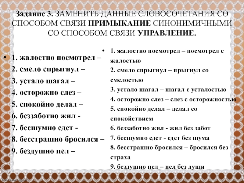Слайд 23Задание 3. ЗАМЕНИТЬ ДАННЫЕ СЛОВОСОЧЕТАНИЯ СО СПОСОБОМ СВЯЗИ ПРИМЫКАНИЕ СИНОНИМИЧНЫМИ СО