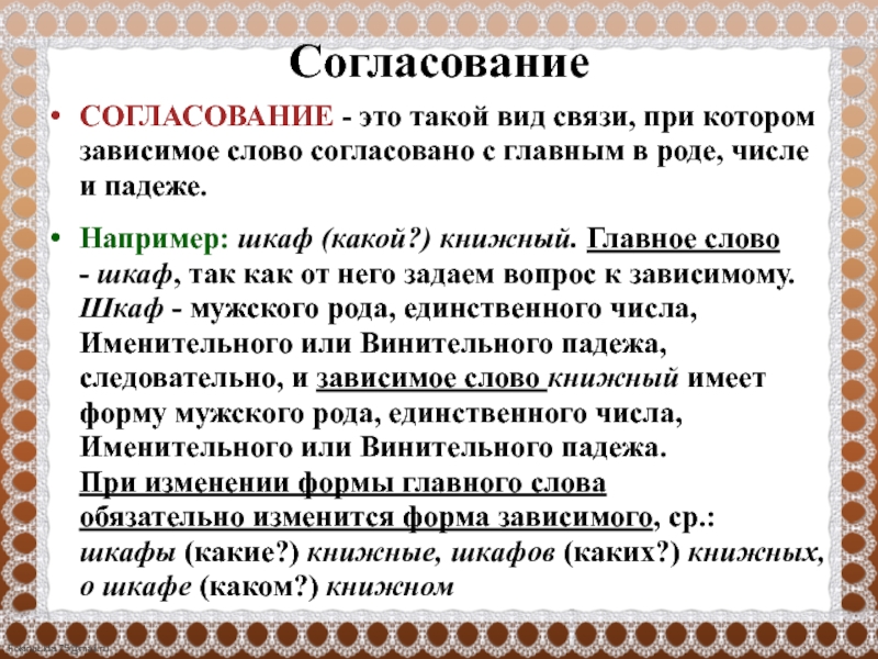 Например: шкаф (какой?) книжный. Главное слово - шкаф, так как от него задаем вопрос к зависимому. Шкаф - мужского рода, единственного числа, Именительного или Винительного падежа, следовательно, и зависимое слово книжный имеет форму мужского рода, единственного числа, Именительного или Винительного падежа.