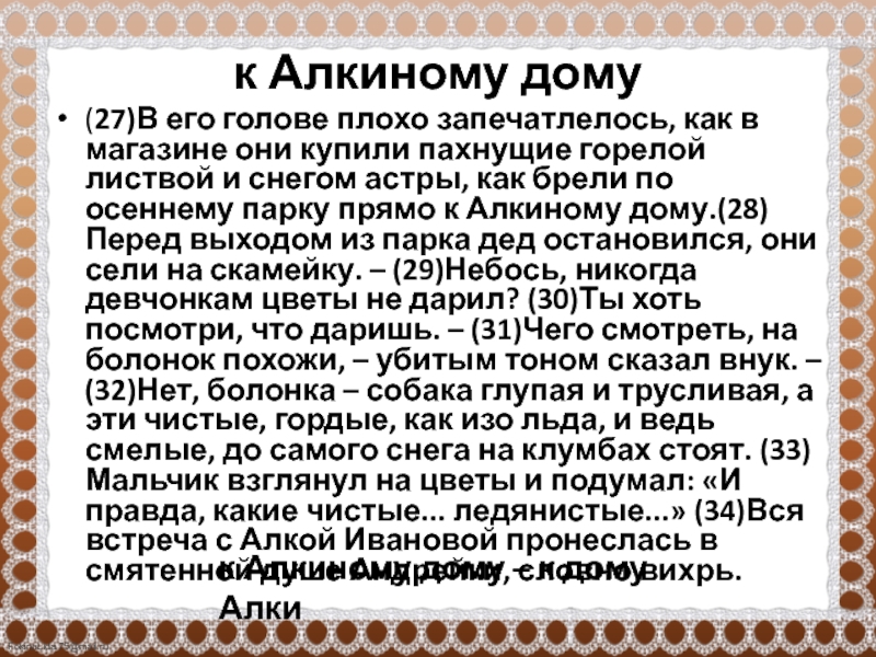 купили пахнущие горелой листвой и снегом астры, как брели по осеннему парку прямо к Алкиному дому.(28)Перед выходом из парка дед остановился, они сели на скамейку. – (29)Небось, никогда девчонкам цветы не дарил? (30)Ты хоть посмотри, что даришь. – (31)Чего смотреть, на болонок похожи, – убитым тоном сказал внук. – (32)Нет, болонка – собака глупая и трусливая, а эти чистые, гордые, как изо льда, и ведь смелые, до самого снега на клумбах стоят. (33)Мальчик взглянул на цветы и подумал: «И правда, какие чистые... ледянистые...» (34)Вся встреча с Алкой Ивановой пронеслась в смятенной душе Андрейки, словно вихрь.