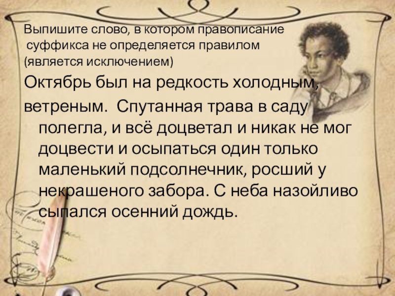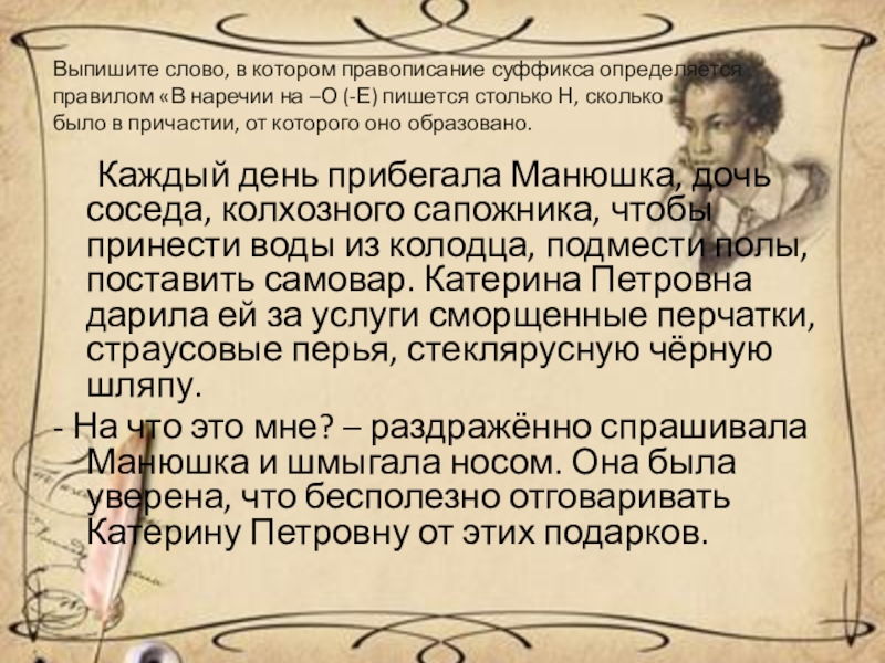 Каждый день прибегала Манюшка, дочь соседа, колхозного сапожника, чтобы принести воды из колодца, подмести полы, поставить самовар. Катерина Петровна дарила ей за услуги сморщенные перчатки, страусовые перья, стеклярусную чёрную шляпу.
