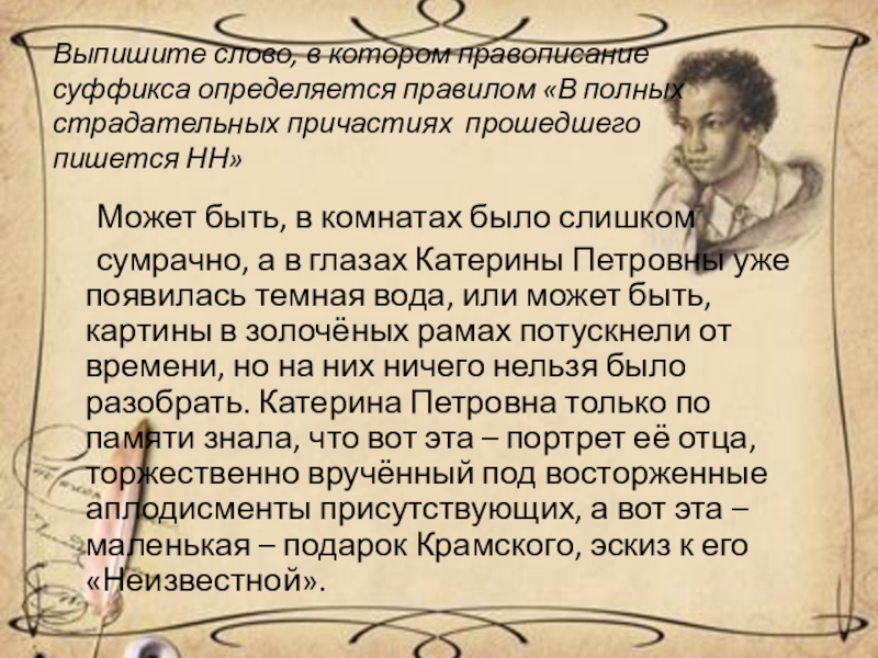 сумрачно, а в глазах Катерины Петровны уже появилась темная вода, или может быть, картины в золочёных рамах потускнели от времени, но на них ничего нельзя было разобрать. Катерина Петровна только по памяти знала, что вот эта – портрет её отца, торжественно вручённый под восторженные аплодисменты присутствующих, а вот эта – маленькая – подарок Крамского, эскиз к его «Неизвестной».