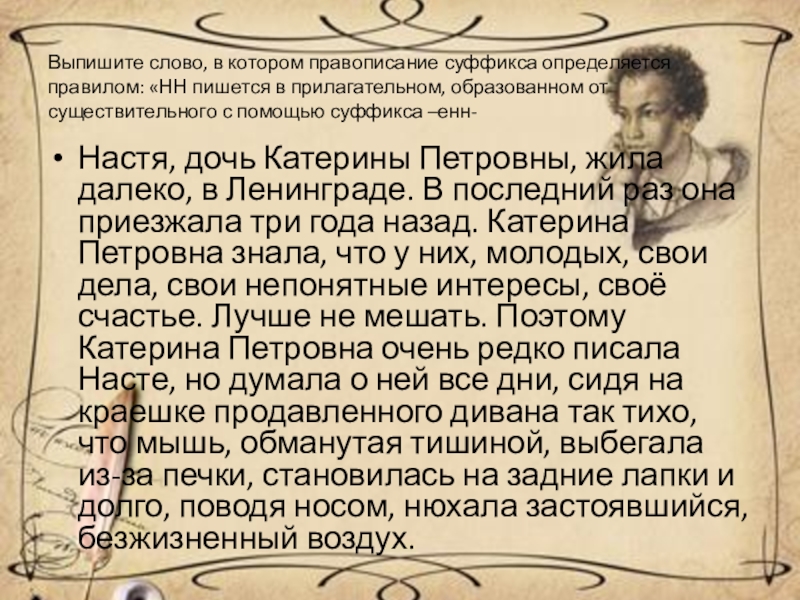 Настя, дочь Катерины Петровны, жила далеко, в Ленинграде. В последний раз она приезжала три года назад. Катерина Петровна знала, что у них, молодых, свои дела, свои непонятные интересы, своё счастье. Лучше не мешать. Поэтому Катерина Петровна очень редко писала Насте, но думала о ней все дни, сидя на краешке продавленного дивана так тихо, что мышь, обманутая тишиной, выбегала из-за печки, становилась на задние лапки и долго, поводя носом, нюхала застоявшийся, безжизненный воздух.