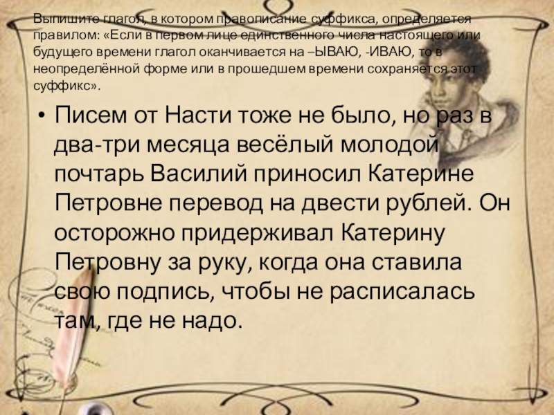 Писем от Насти тоже не было, но раз в два-три месяца весёлый молодой почтарь Василий приносил Катерине Петровне перевод на двести рублей. Он осторожно придерживал Катерину Петровну за руку, когда она ставила свою подпись, чтобы не расписалась там, где не надо.