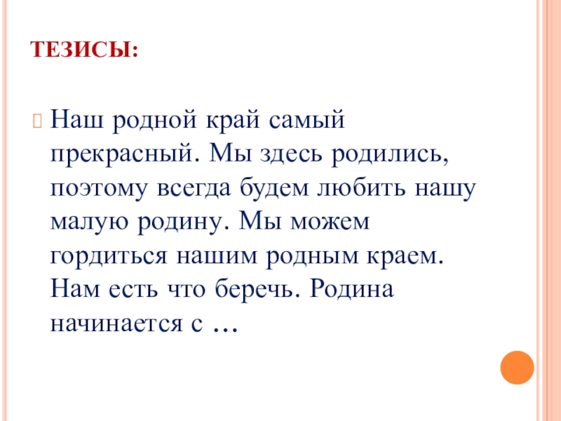 любить нашу малую родину. Мы можем гордиться нашим родным краем. Нам есть что беречь. Родина начинается с …