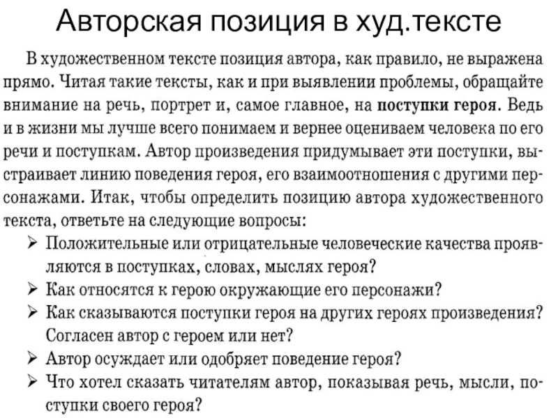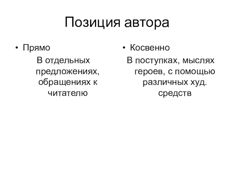 Позиция автора ПрямоВ отдельных предложениях, обращениях к читателюКосвенноВ поступках, мыслях героев, с помощью различных худ.средств