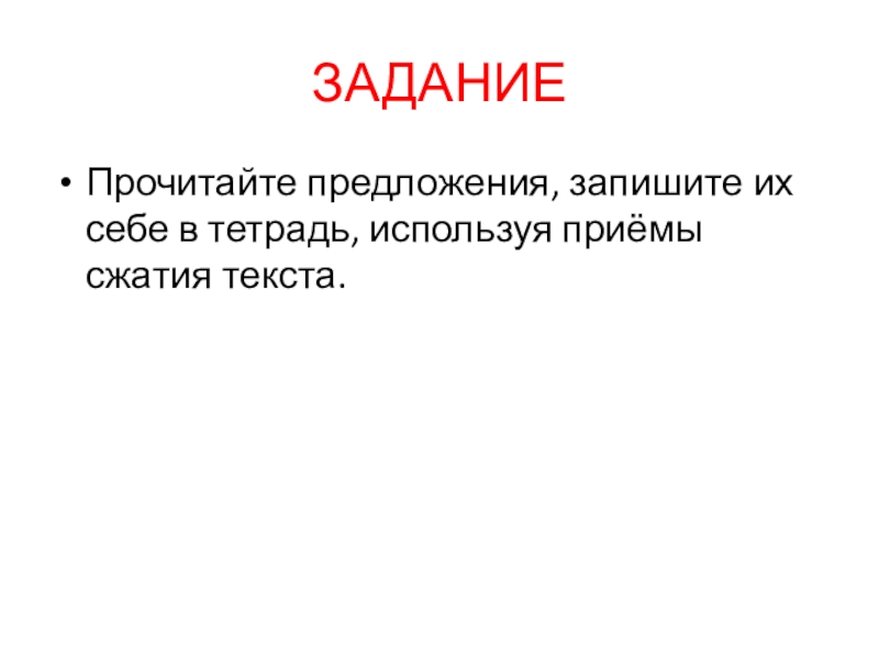 ЗАДАНИЕПрочитайте предложения, запишите их себе в тетрадь, используя приёмы сжатия текста.