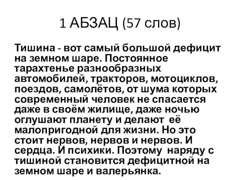 1 АБЗАЦ (57 слов)Тишина - вот самый большой дефицит на земном шаре. Постоянное тарахтенье разнообразных автомобилей, тракторов,