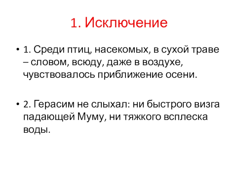 1. Исключение1. Среди птиц, насекомых, в сухой траве – словом, всюду, даже в воздухе, чувствовалось приближение осени.2.