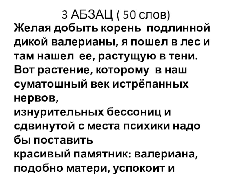 3 АБЗАЦ ( 50 слов)Желая добыть корень  подлинной дикой валерианы, я пошел в лес и  там нашел  ее, растущую
