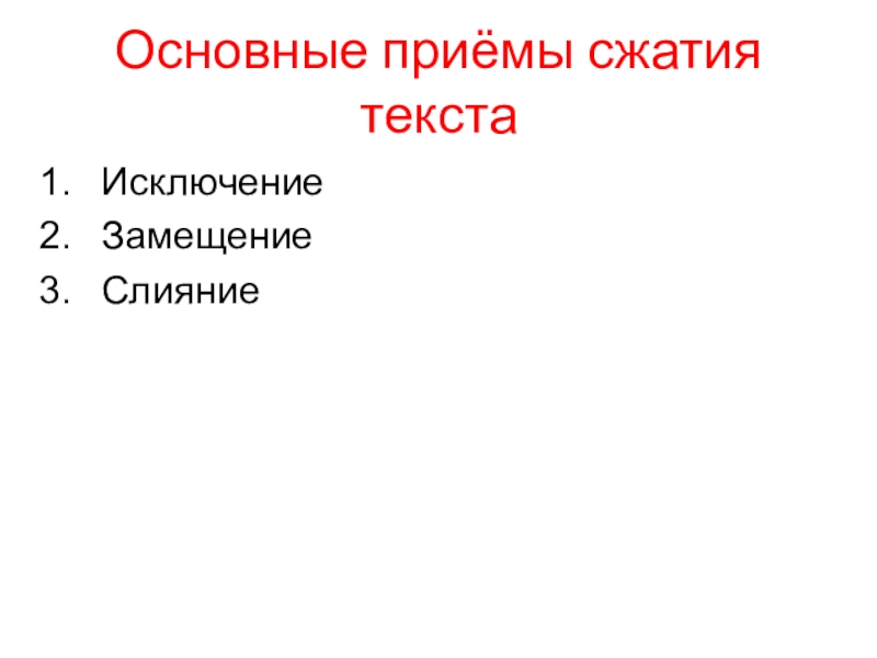 Основные приёмы сжатия текстаИсключениеЗамещениеСлияние