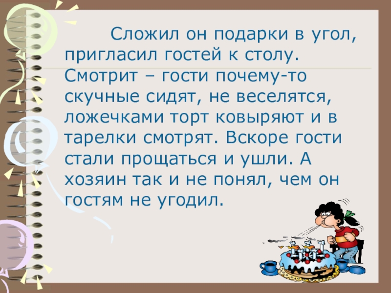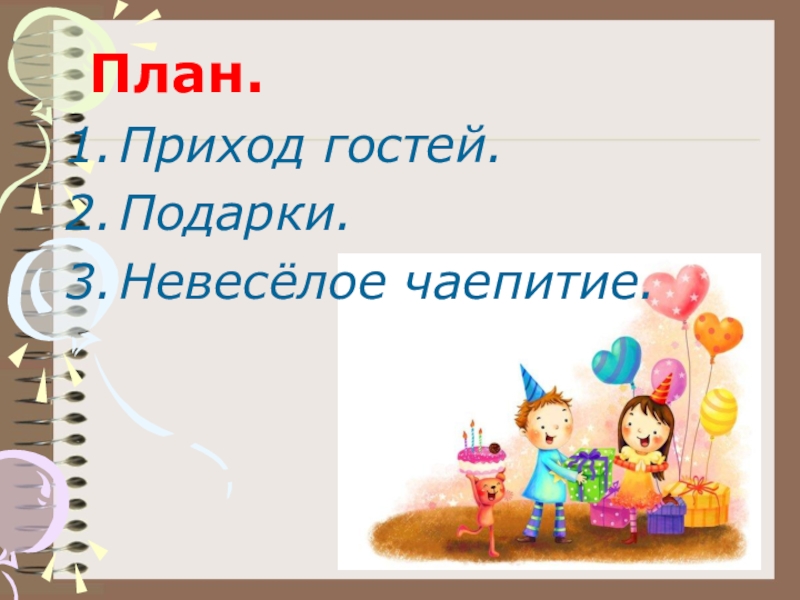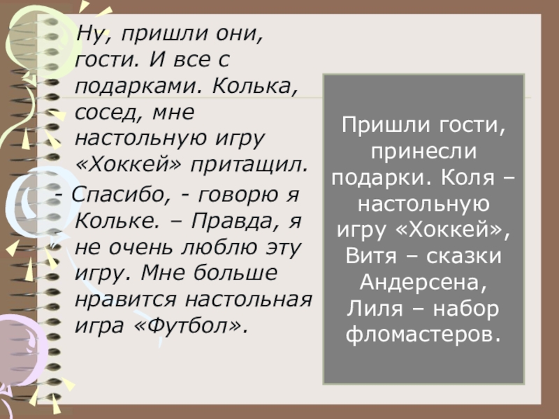 Пришли гости, принесли подарки. Коля – настольную игру «Хоккей», Витя – сказки Андерсена, Лиля – набор фломастеров.