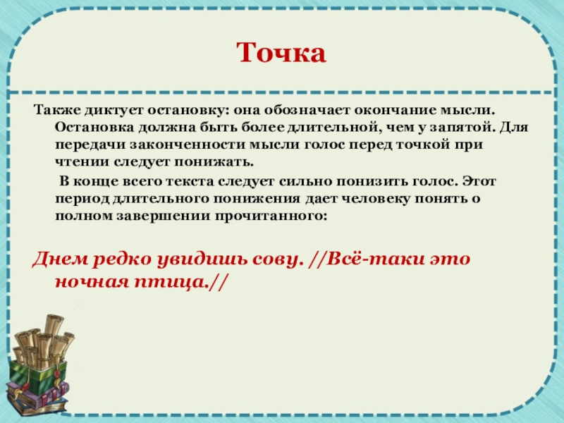 длительной, чем у запятой. Для передачи законченности мысли голос перед точкой при чтении следует понижать.