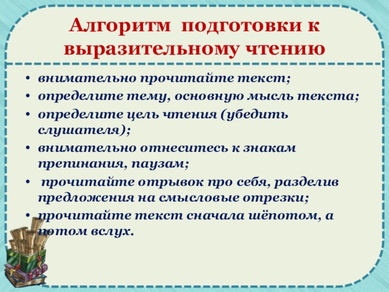 Слайд 3Алгоритм подготовки к выразительному чтению
