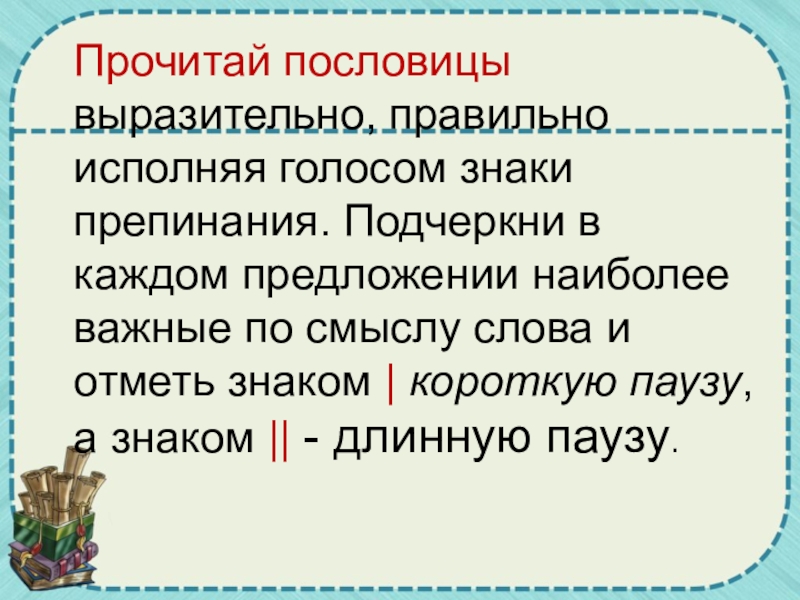 Слайд 21Прочитай пословицы выразительно, правильно исполняя голосом знаки препинания. Подчеркни в каждом
