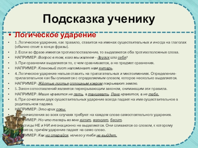 1. Логическое ударение, как правило, ставится на именах существительных и
