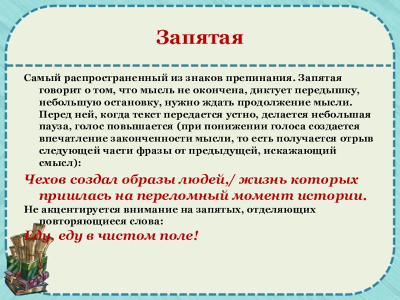Самый распространенный из знаков препинания. Запятая говорит о том, что мысль