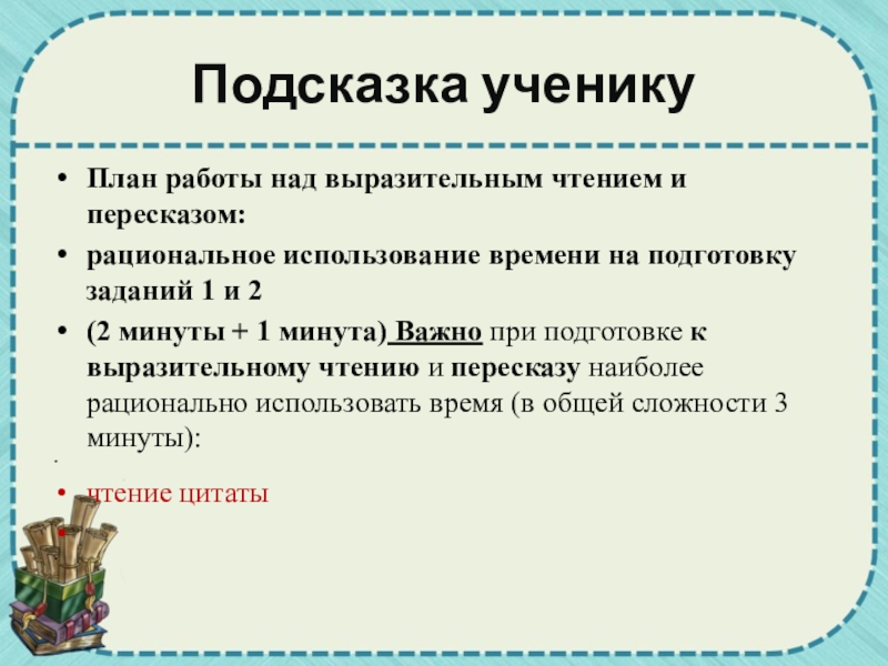 (2 минуты + 1 минута) Важно при подготовке к выразительному чтению и пересказу наиболее рационально использовать время (в общей сложности 3 минуты):