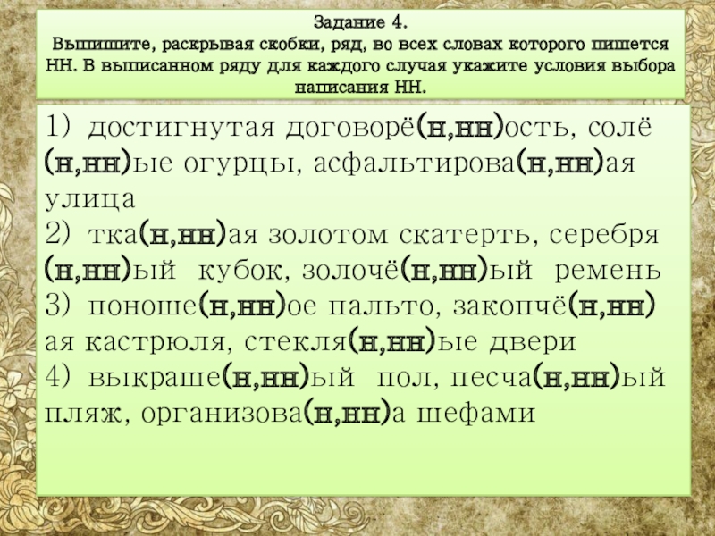 3) поноше(н,нн)ое пальто, закопчё(н,нн)ая кастрюля, стекля(н,нн)ые двери