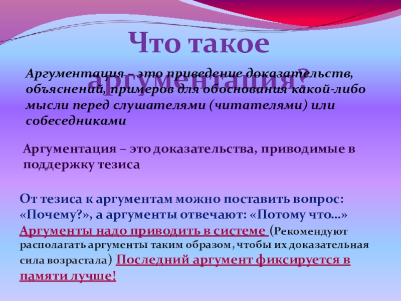 Аргументы надо приводить в системе (Рекомендуют располагать аргументы таким образом, чтобы их доказательная сила возрастала) Последний аргумент фиксируется в памяти лучше!