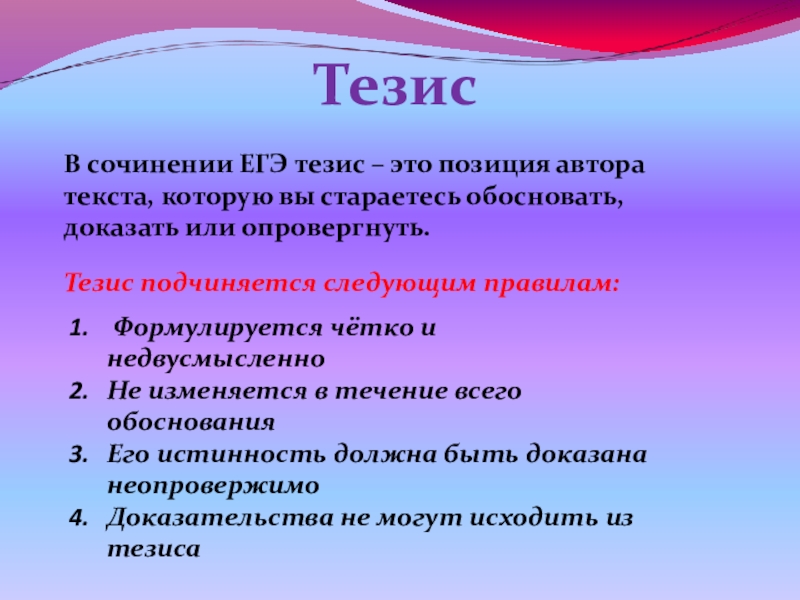 В сочинении ЕГЭ тезис – это позиция автора текста, которую вы