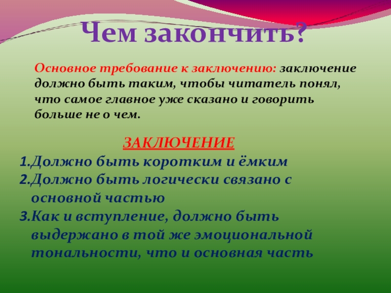 Основное требование к заключению: заключение должно быть таким, чтобы читатель