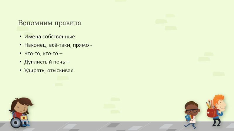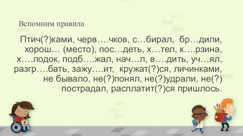 Вспомним правилаПтич(?)ками, черв….чков, с…бирал, бр…дили, хорош… (место), пос…деть, х…тел, к….рзина, х….лодок, подб….жал, нач…л, в….дить, уч…ял, разгр….бать, зажу….ит,