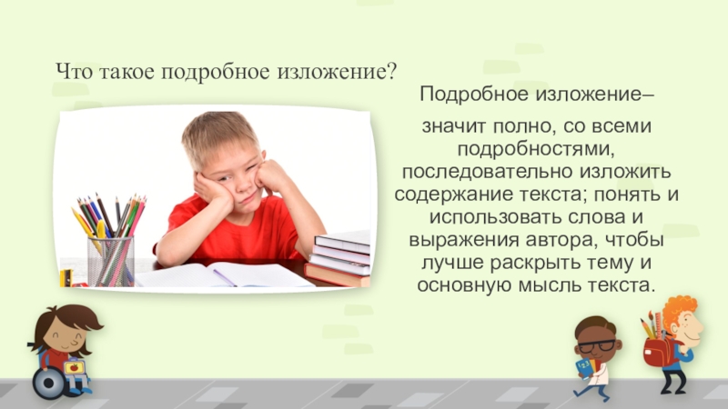 Что такое подробное изложение?Подробное изложение– значит полно, со всеми подробностями, последовательно изложить содержание текста; понять и использовать