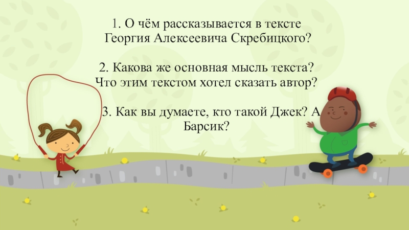 1. О чём рассказывается в тексте  Георгия Алексеевича Скребицкого?  2. Какова же основная мысль текста?