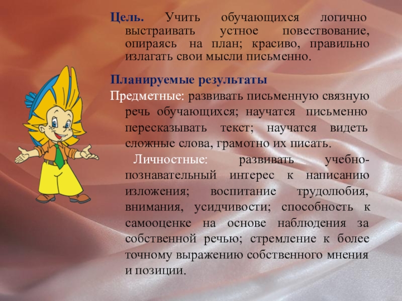 Слайд 2Цель. Учить обучающихся логично выстраивать устное повествование, опираясь на план; красиво,