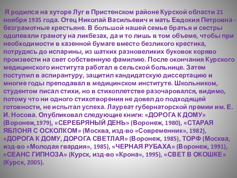 Слайд 30 Я родился на хуторе Луг в Пристенском районе Курской области