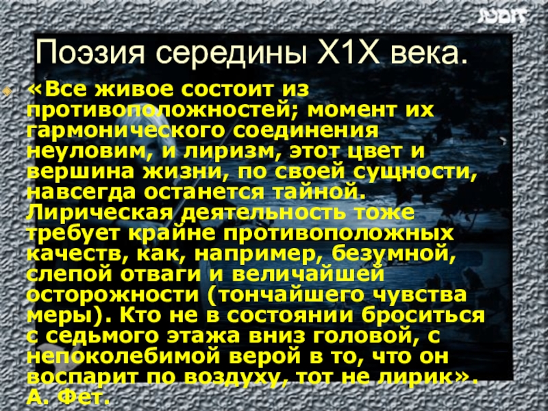 соединения неуловим, и лиризм, этот цвет и вершина жизни, по своей сущности, навсегда останется тайной. Лирическая деятельность тоже требует крайне противоположных качеств, как, например, безумной, слепой отваги и величайшей осторожности (тончайшего чувства меры). Кто не в состоянии броситься с седьмого этажа вниз головой, с непоколебимой верой в то, что он воспарит по воздуху, тот не лирик». А. Фет.
