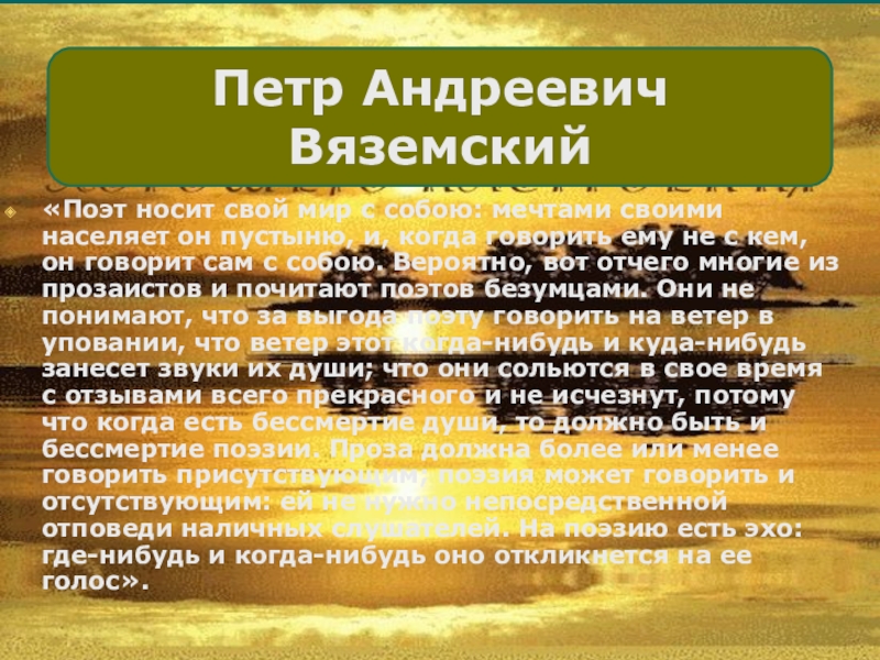 Слайд 2«Поэт носит свой мир с собою: мечтами своими населяет он пустыню,