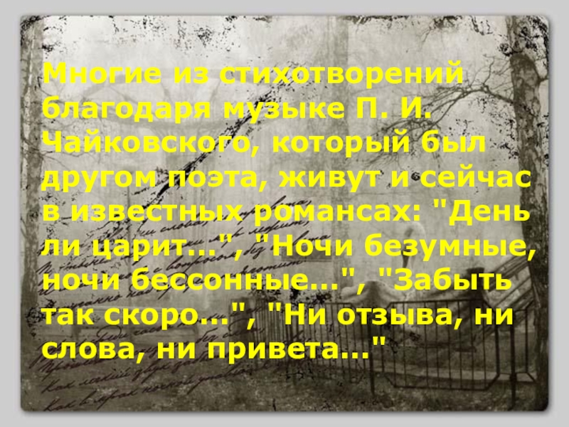 Слайд 4Многие из стихотворений благодаря музыке П. И. Чайковского, который был другом