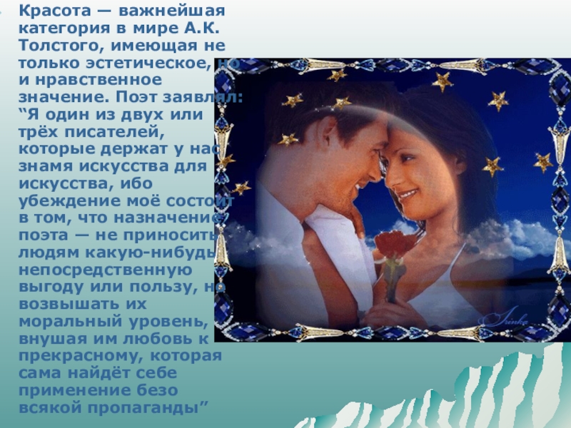 Слайд 11Красота — важнейшая категория в мире А.К. Толстого, имеющая не только