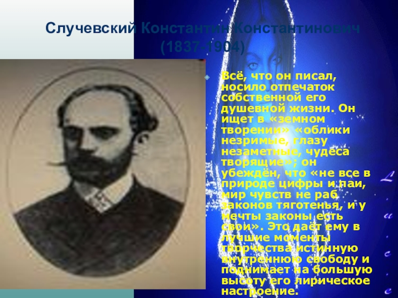 жизни. Он ищет в «земном творении» «облики незримые, глазу незаметные, чудеса творящие»; он убеждён, что «не все в природе цифры и паи, мир чувств не раб законов тяготенья, и у мечты законы есть свои». Это даёт ему в лучшие моменты творчества истинную внутреннюю свободу и поднимает на большую высоту его лирическое настроение.