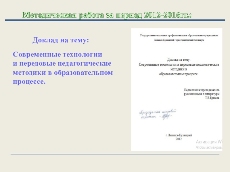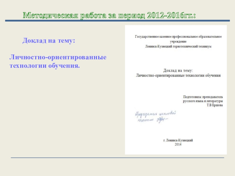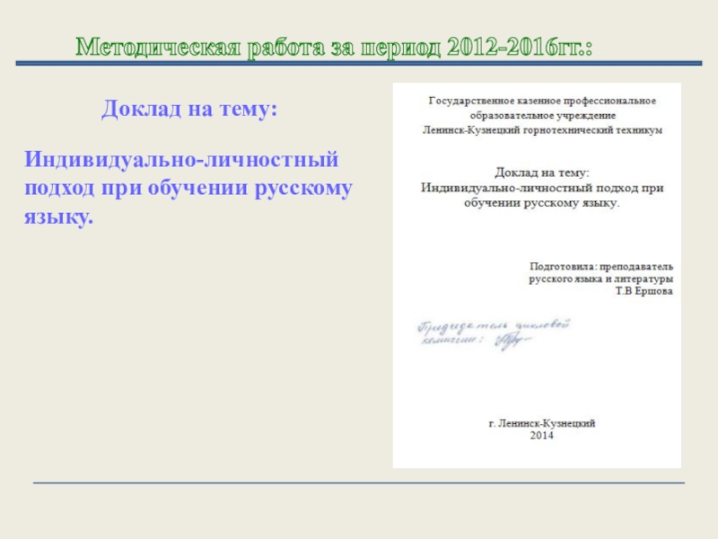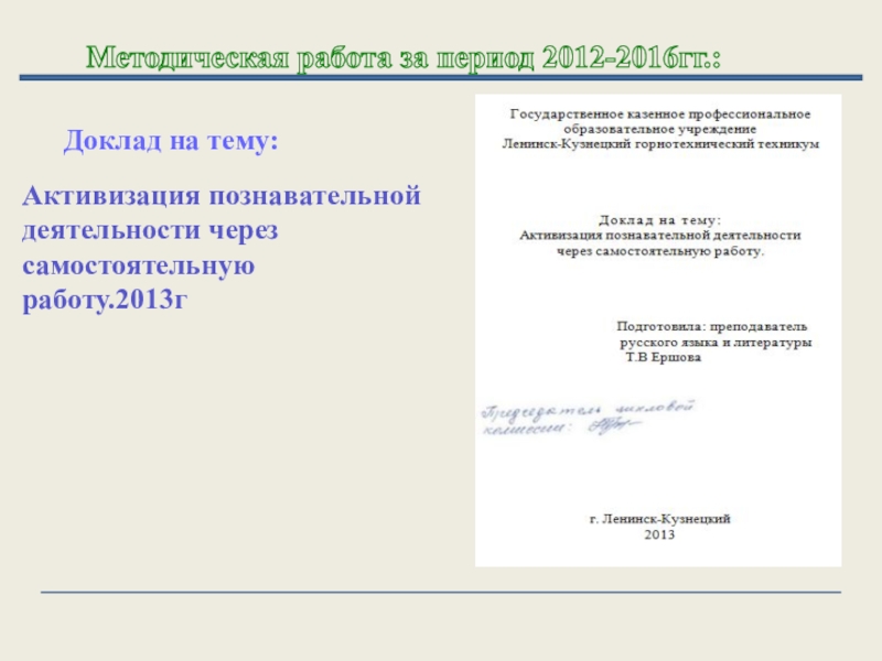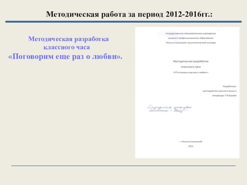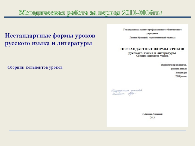 В 2012 году разработала методические рекомендации по выполнению и оформлению практических работ по учебным дисциплинам Русский язык и Литература;