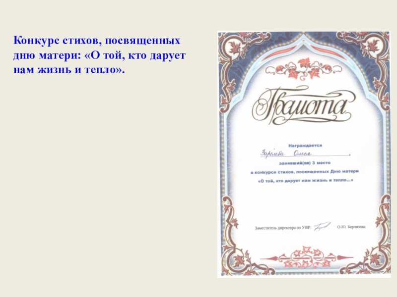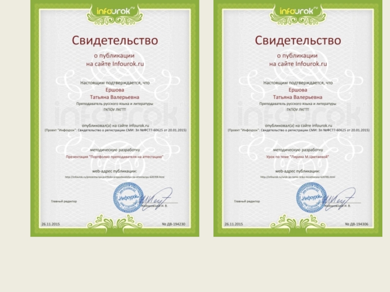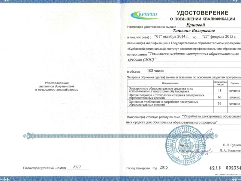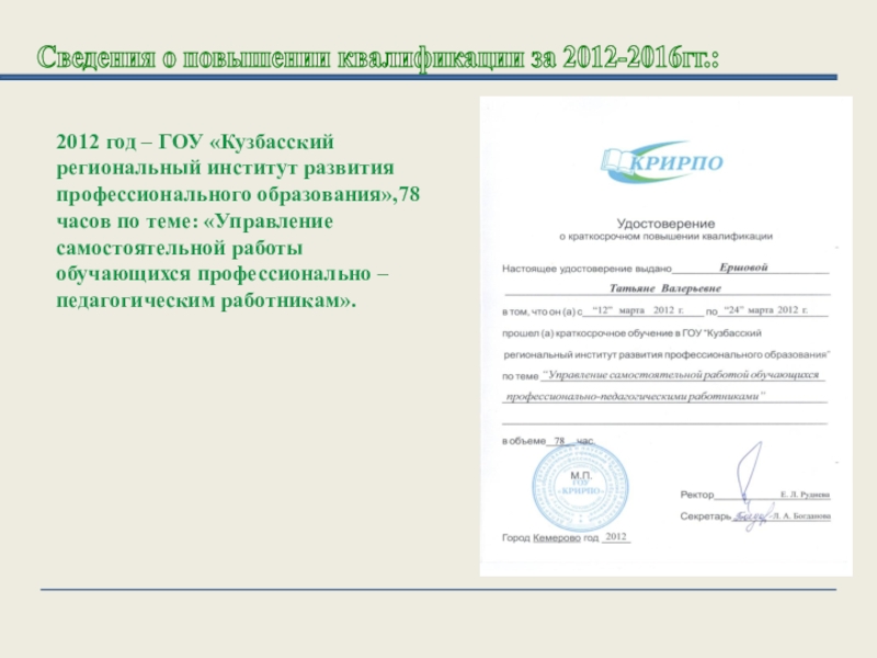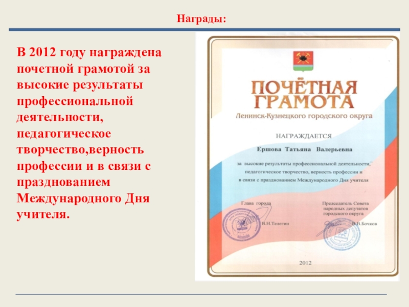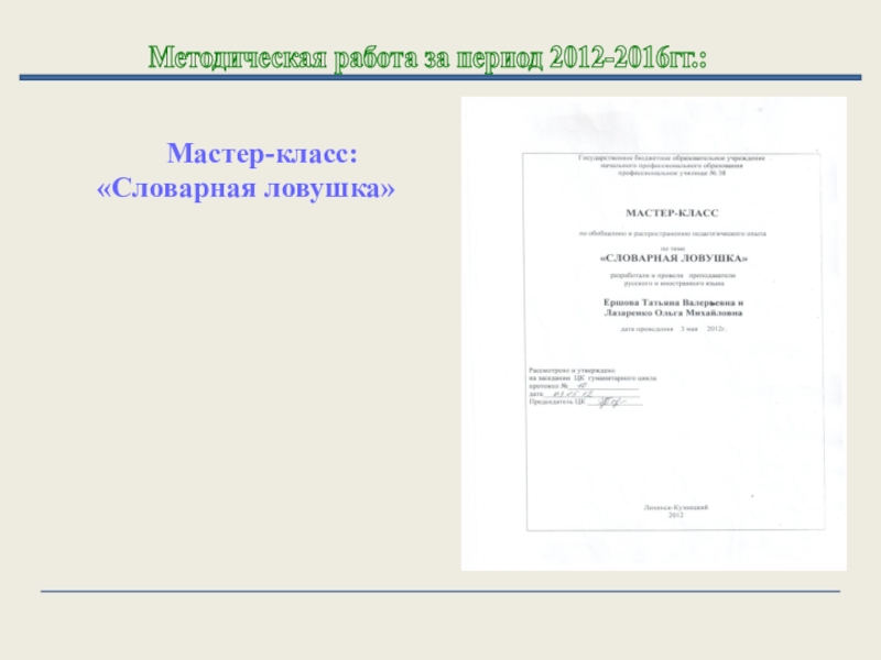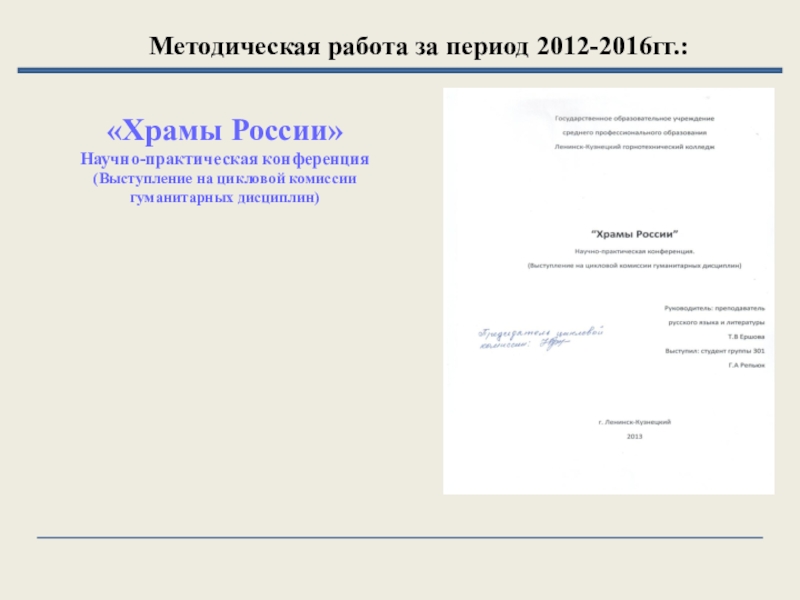 В 2012 году разработала методические рекомендации по выполнению и оформлению практических работ по учебным дисциплинам Русский язык и Литература;
