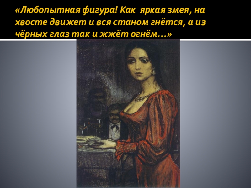 «Любопытная фигура! Как яркая змея, на хвосте движет и вся станом гнётся, а из чёрных глаз так