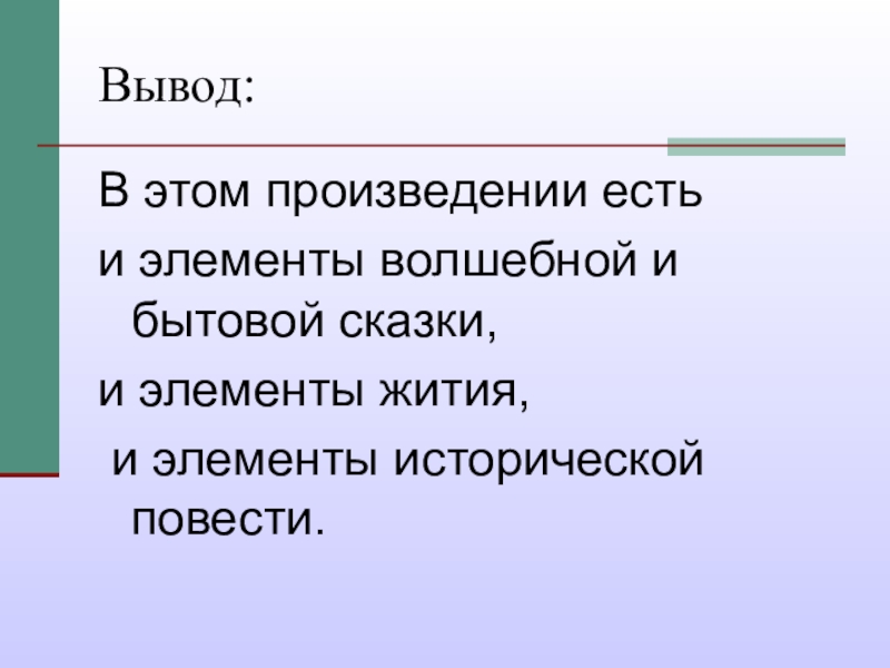 Вывод:В этом произведении есть и элементы волшебной и бытовой сказки, и элементы жития, и элементы исторической повести.