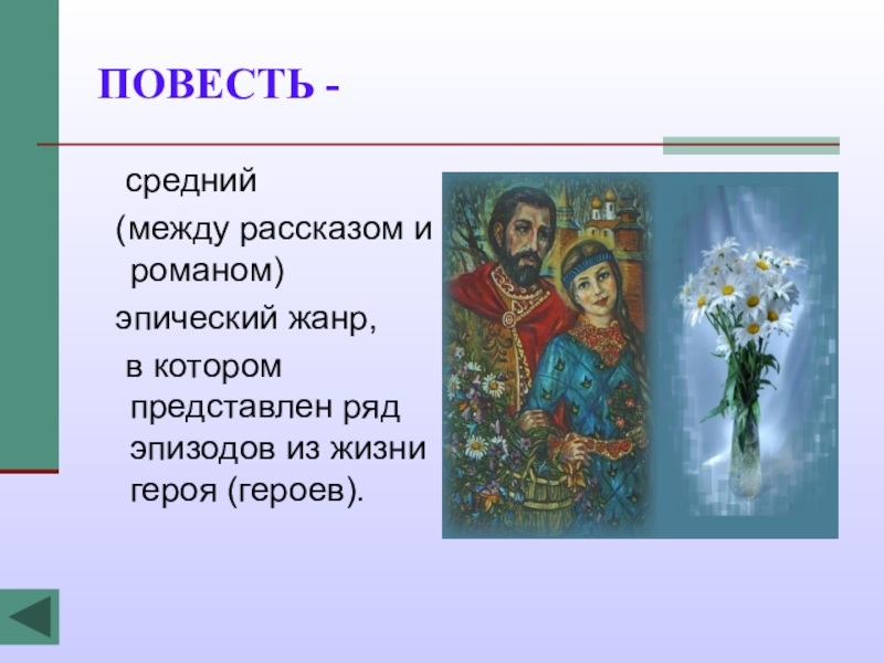 ПОВЕСТЬ -  средний  (между рассказом и романом) эпический жанр,  в котором представлен ряд эпизодов