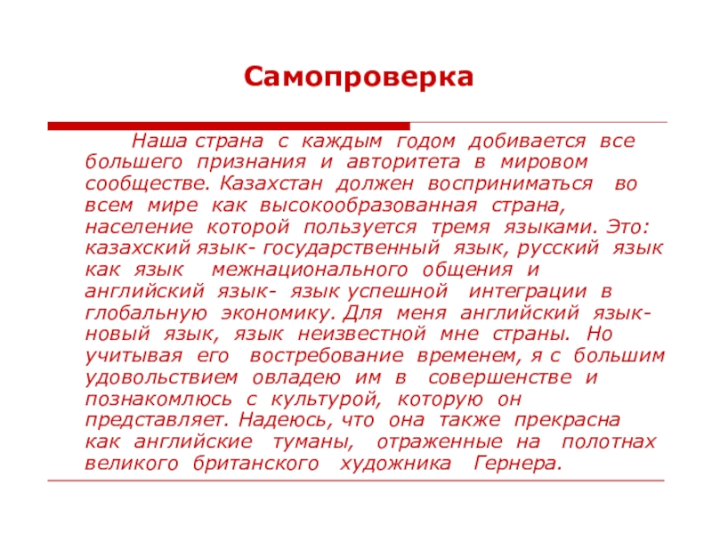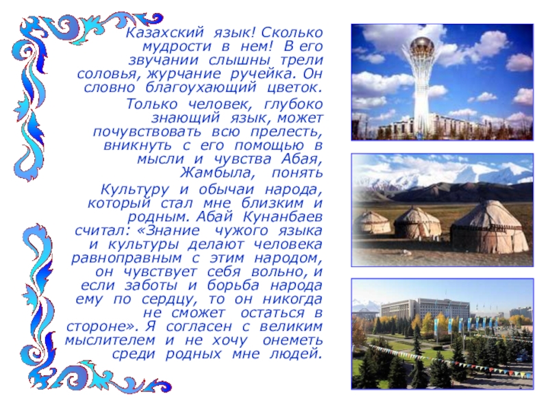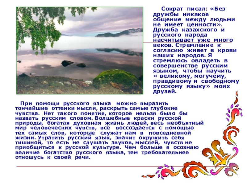 Сократ писал: «Без дружбы никакое общение между людьми не имеет ценности». Дружба казахского и русского народа насчитывает уже много веков. Стремление к согласию живет в крови наших народов. Я стремлюсь овладеть в совершенстве русским языком, чтобы научить « великому, могучему, правдивому и свободному русскому языку» моих друзей.