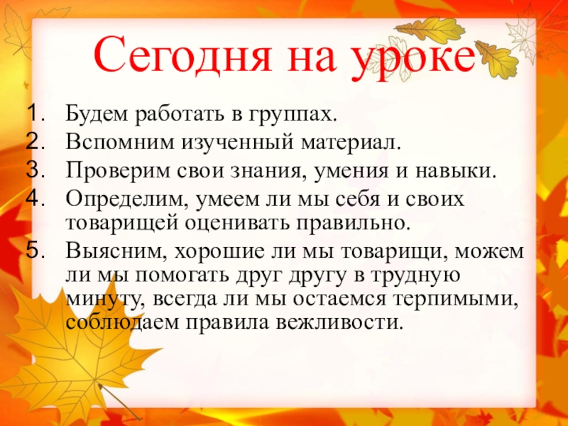 Сегодня на урокеБудем работать в группах.Вспомним изученный материал.Проверим свои знания, умения и навыки.Определим, умеем ли мы себя