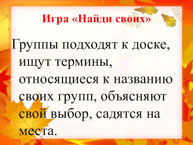 Игра «Найди своих»Группы подходят к доске, ищут термины, относящиеся к названию своих групп, объясняют свой выбор, садятся